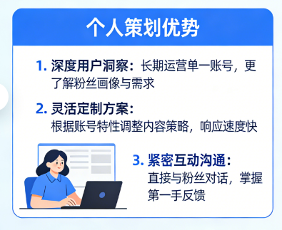 而个人新媒体策划的优势,在于“个性化、灵活、高性价比”。个人策划会全程对接,深入了解你的账号需求和个人风格,定制专属的策划方案,没有模板化内容,每一个细节都贴合你的账号实际情况;沟通直接,没有层层审批,有问题可以随时沟通,调整方案快速高效;价格相对亲民,适合中小账号、个人账号、创业账号,预算有限但想实现精准破局的人群。